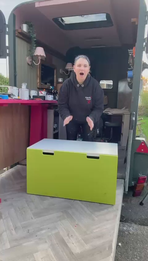 DIY Expert Kayleigh found this IKEA toy box for £10 in a charity shop; it just needed a good clean up with Sugar Soap. She used some MDF to make a shaker style front and sanded everything down with a 120-grit sandpaper. For the paint, Kayleigh used Dusky Blush and Boho Berry which complement each other so well. She used Kings Gold for the letters for the name and finished off the toy box with some scaffolding boards on top of the toy box, cut to size and stained in Browning Wax.