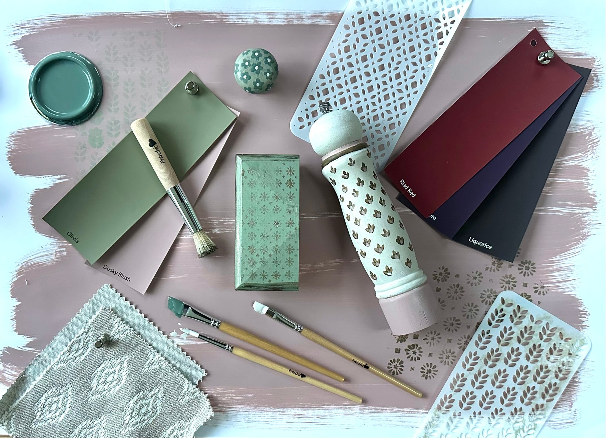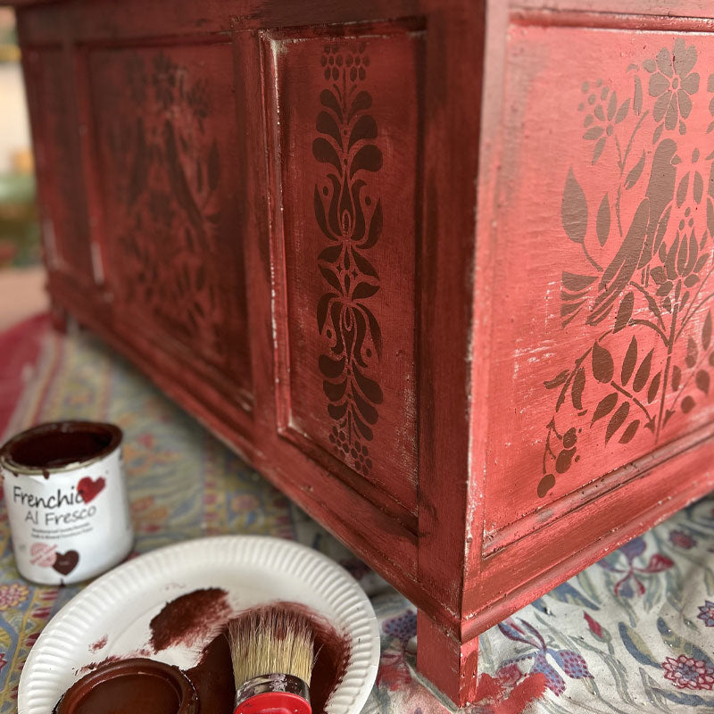 one-off pieces in our home. Think folk art influences using layered colour and hand-painting with Frenchic’s decorative brushes or stencilling like Creative Artisan Karen’s fantastic blanket box (pictured below).