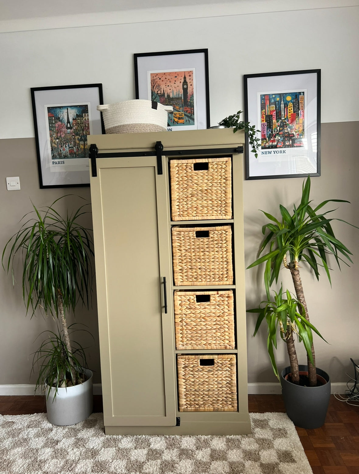 Taking out two shelves with my multi-tool gave space for hanging clothes and I added MDF on the back, using glue and a nail gun, then sealed up the edges using caulk. For the hardware, I bought a barn door kit from Amazon which I attached to the KALLAX. I made the actual barn door out of MDF and painted it in Funky Dora, using screws as runners to slide the door across. I absolutely love the result!